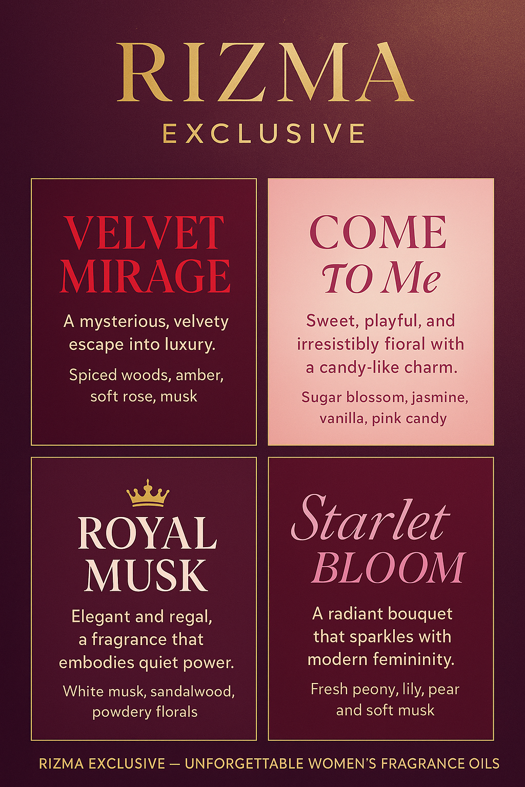 ✨ Choose your signature scent today and let RIZMA Exclusive Fragrance Oils become your unforgettable fragrance story.